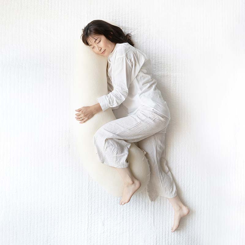 お腹を少し乗せるようにしてみたり、ピッタリ添わせてみたり、さまざまなパターンを試してリラックスできる姿勢を探してみてください。抱き枕の上に腕や太ももを預けることで全身のリラックスにもなり、産前産後問わずも睡眠のサポートとしてずっと使い続けたくなる心地よさです。